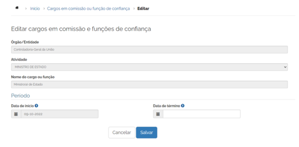 IMPORTANTE: A inativação de um cargo ou função é irreversível e acarreta a inativação automática de todos os Agentes Públicos Obrigados vinculados a esse cargo, assim como a despublicação automática de compromissos que tenham sido publicados em data posterior à data preenchida como data de término do cargo ou função.