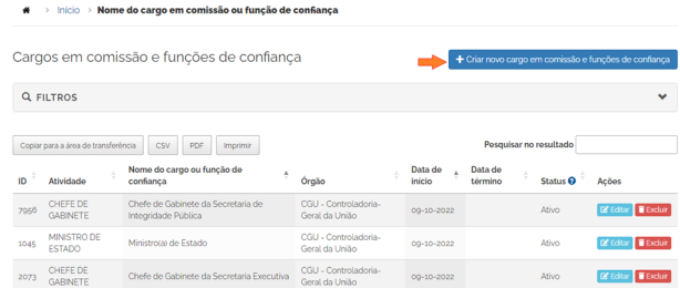Os órgãos/entidades da Administração Indireta, caso não encontrem entre as opções listadas o “código do cargo ou função de confiança” de seu órgão, podem cadastrar novos. Para cadastrar um novo código: