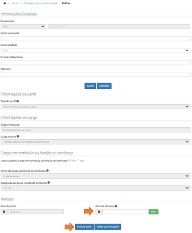 Orientamos que a "Data de Término" não seja informada com antecedência, mas apenas quando efetivamente deva se realizar a inativação do perfil.
